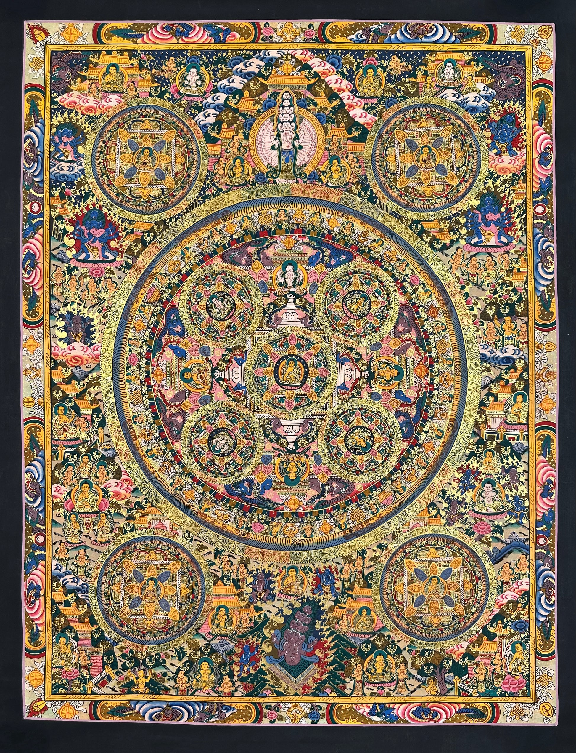 Thangka painting depicting Buddha Mandala is perfect for various home and office decor ideas. This 100% handmade Thangka can be decorated as an elegant and eccentric wall hanging in your home or office. It can also be placed in your home for meditation purposes, as well as an artifact to your spiritual seeking.