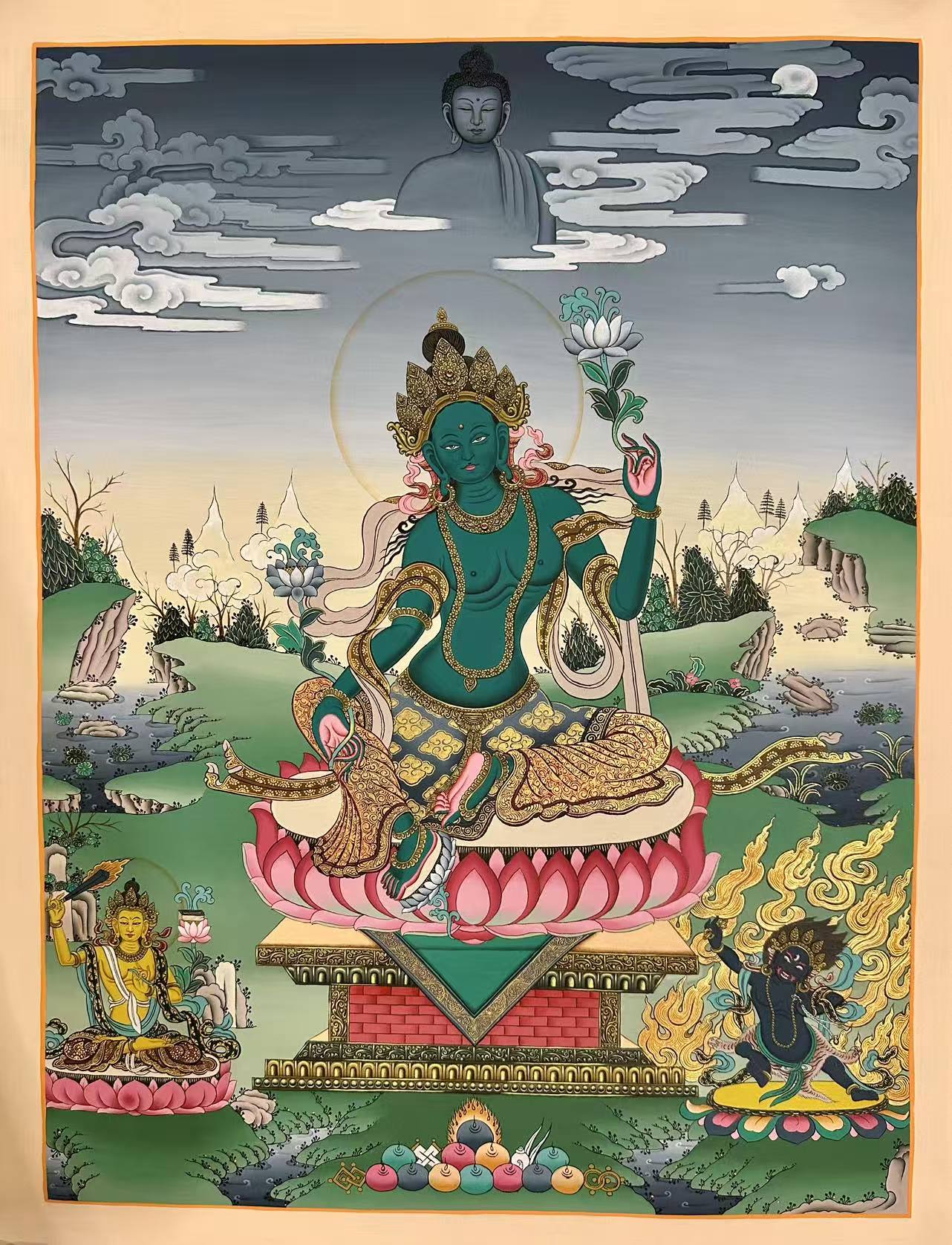 Thangka painting depicting Green Tara is perfect for various home and office decor ideas. This 100% handmade Thangka can be decorated as an elegant and eccentric wall hanging in your home or office. It can also be placed in your home for meditation purposes, as well as an artifact to your spiritual seeking.