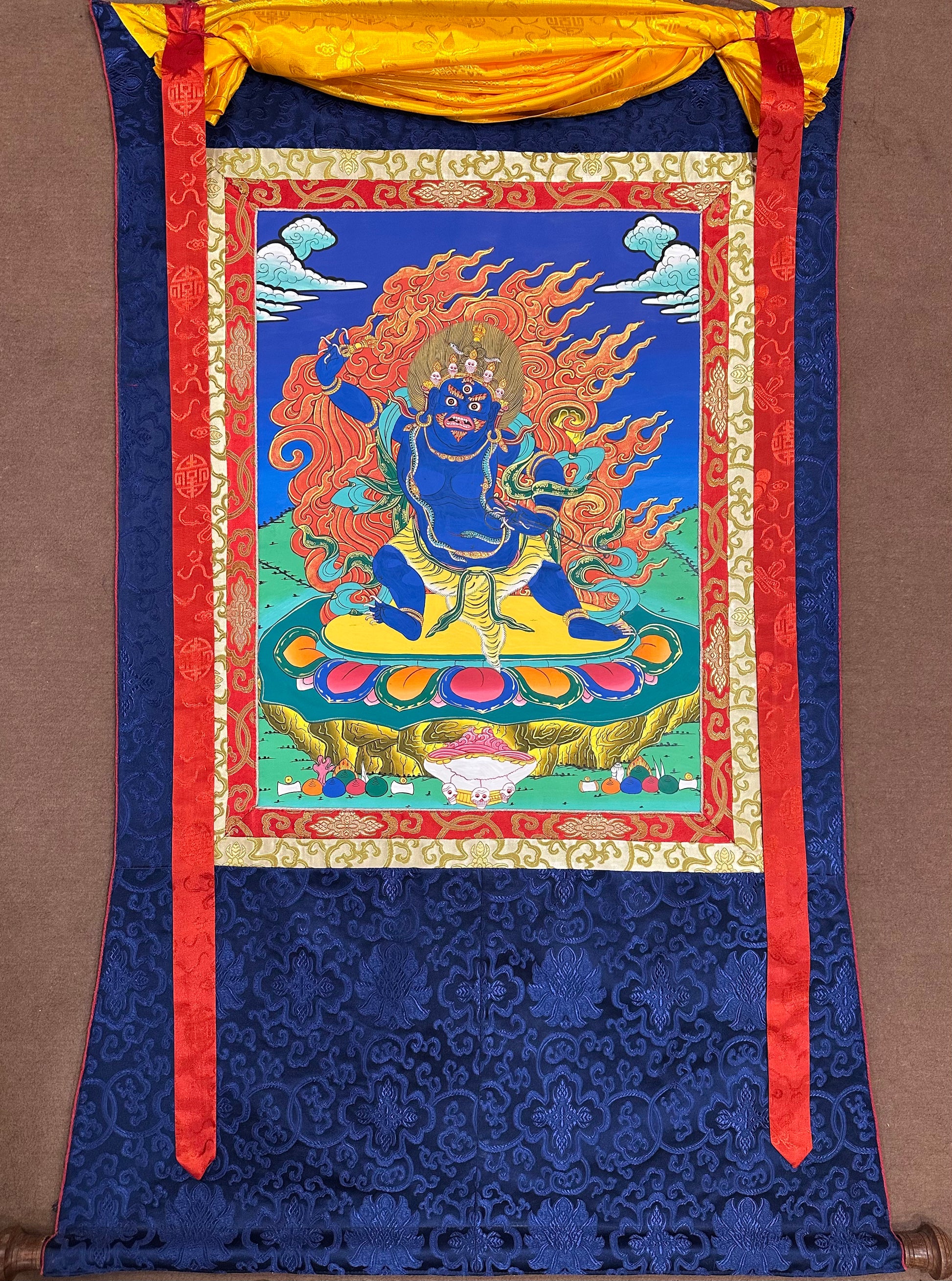 He is unclothed except for his adornments. His erect phallus has a red tip, and there is a flame aureole behind him. His central main hands hold a chopping knife (Kartika), representing his ability to cut the root of delusion, and a human skull bowl (Kapala) filled with blood, symbolizing his victory over the forces of death.
